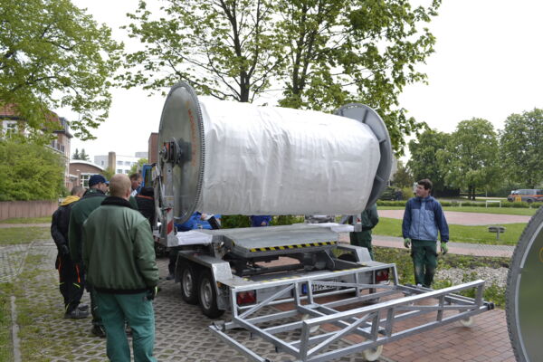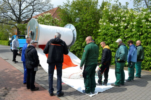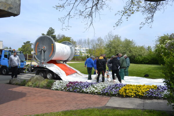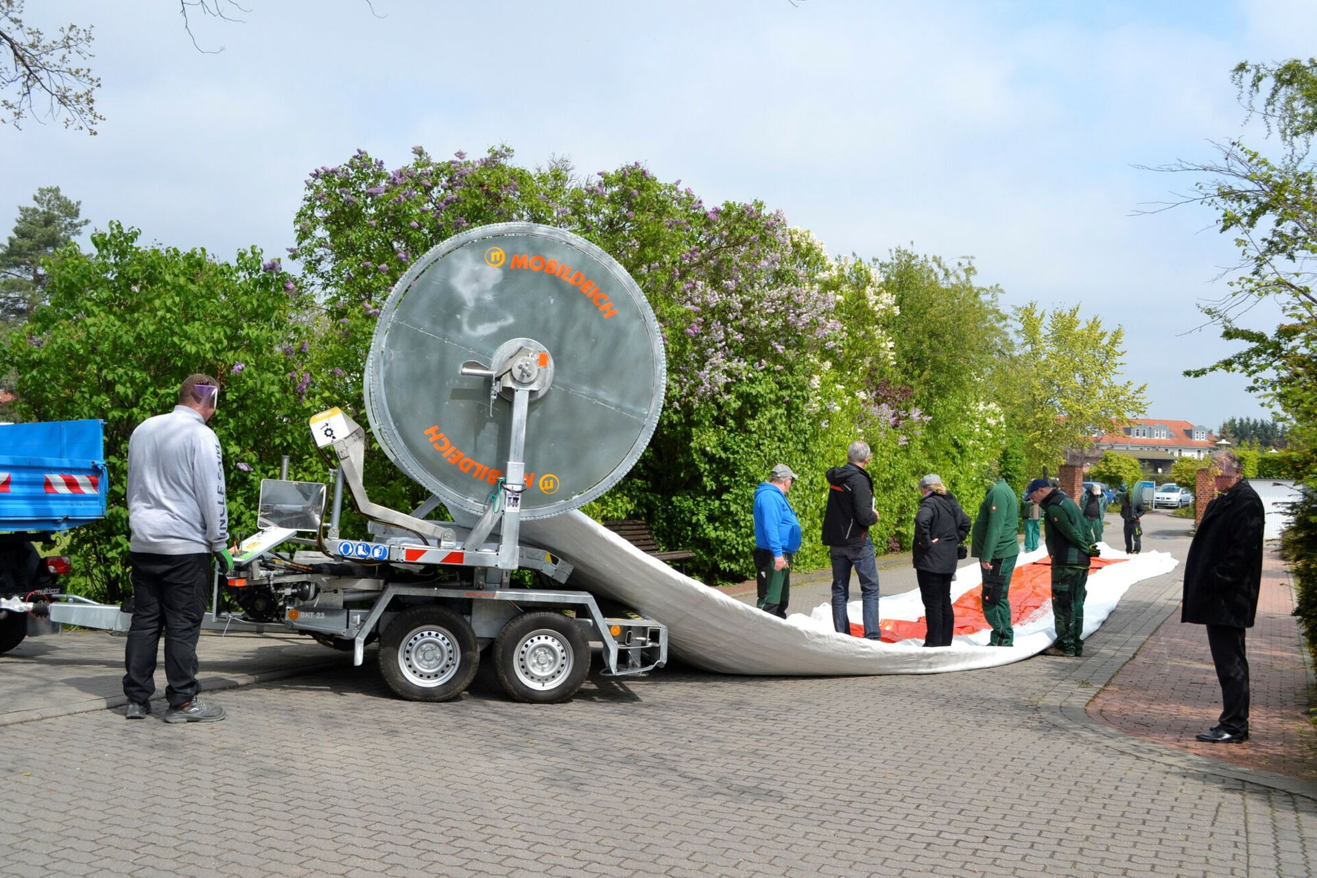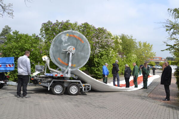 Danach fährt das Deichmobil los und der Deich rollt sich selbsttätig ab.