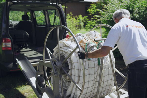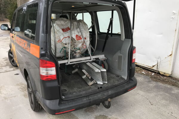 Der Hand-ROLL-Wagen kann mit Rampen aus dem VW-Bus gerollt werden, oder auf einer Hebebühne den LKW verlassen. Weitere Trommeln können direkt aus dem Fahrzeug gerollt und später in den Hand-ROLL-Wagen geladen werden.