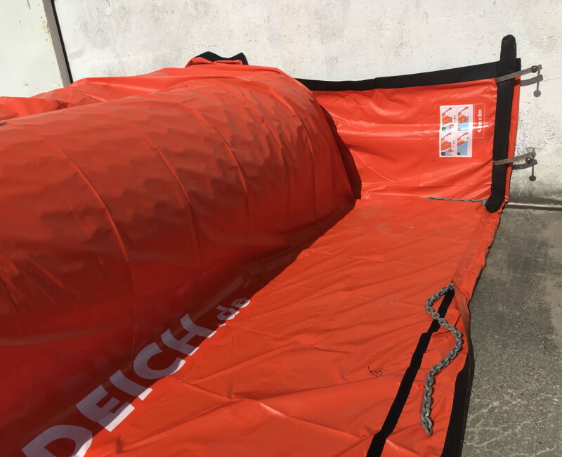 Das Mobildeich-System bietet herausragenden Schutz vor Hochwasser durch eine Kombination aus drei hochwirksamen Komponenten: robuste PVC-beschichtete Polyesterschläuche, eine stabile Netzhülle aus Polyester-Seil und eine reißfeste Dichtungsplane. Diese Elemente arbeiten nahtlos zusammen, um auch unter extremen Bedingungen zuverlässigen Schutz zu gewährleisten.