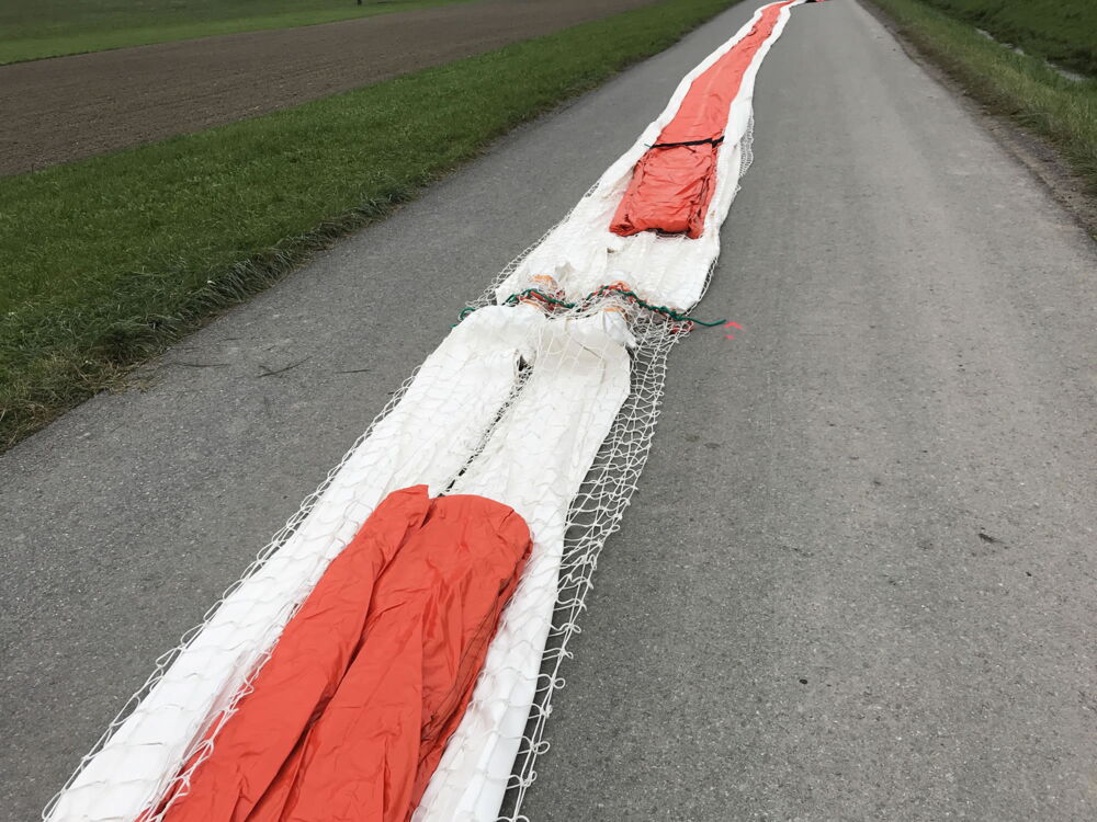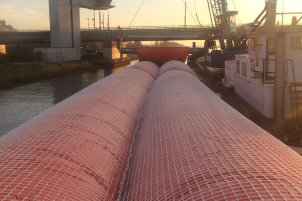 Die MOBILDEICH-Netzhülle bietet als weiteren Vorteil das Auffangen der inneren Kräfte zwischen den wassergefüllten Schläuchen.