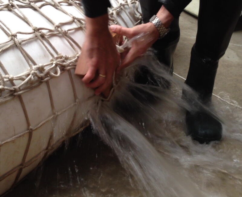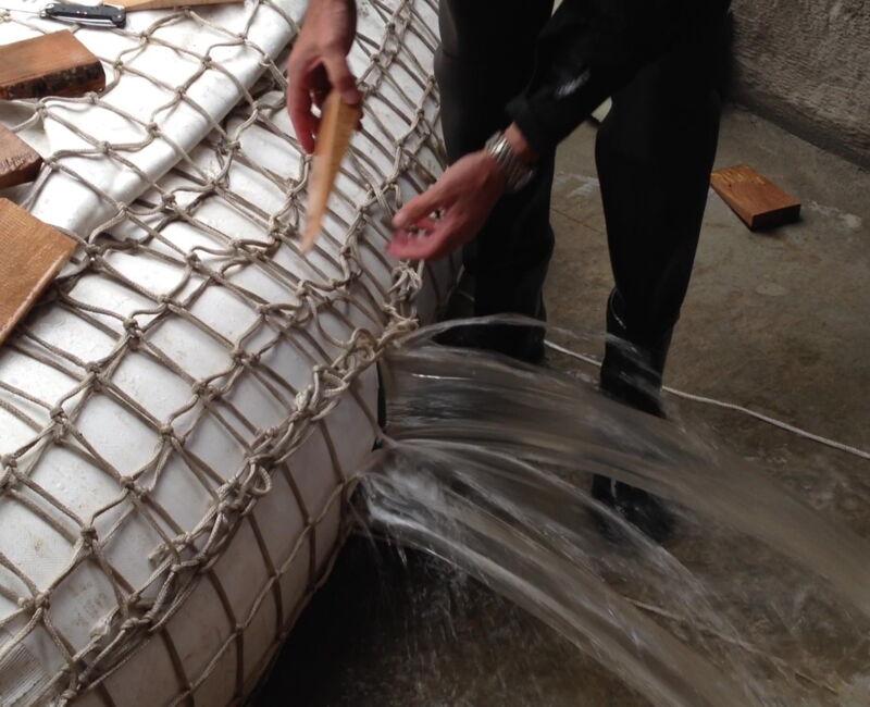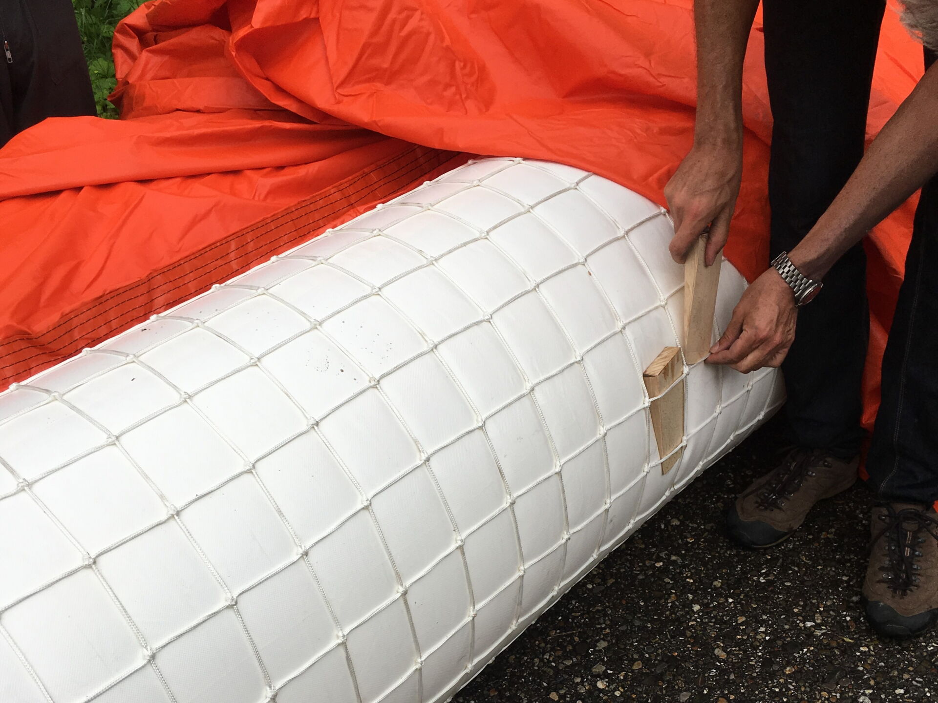 Die Keile unter dem Netz dicht zusammen schieben verbessert das Ergebnis weiter: So einfach kann der MOBILDEICH noch Monate Wasser sicher umleiten und zurückhalten.