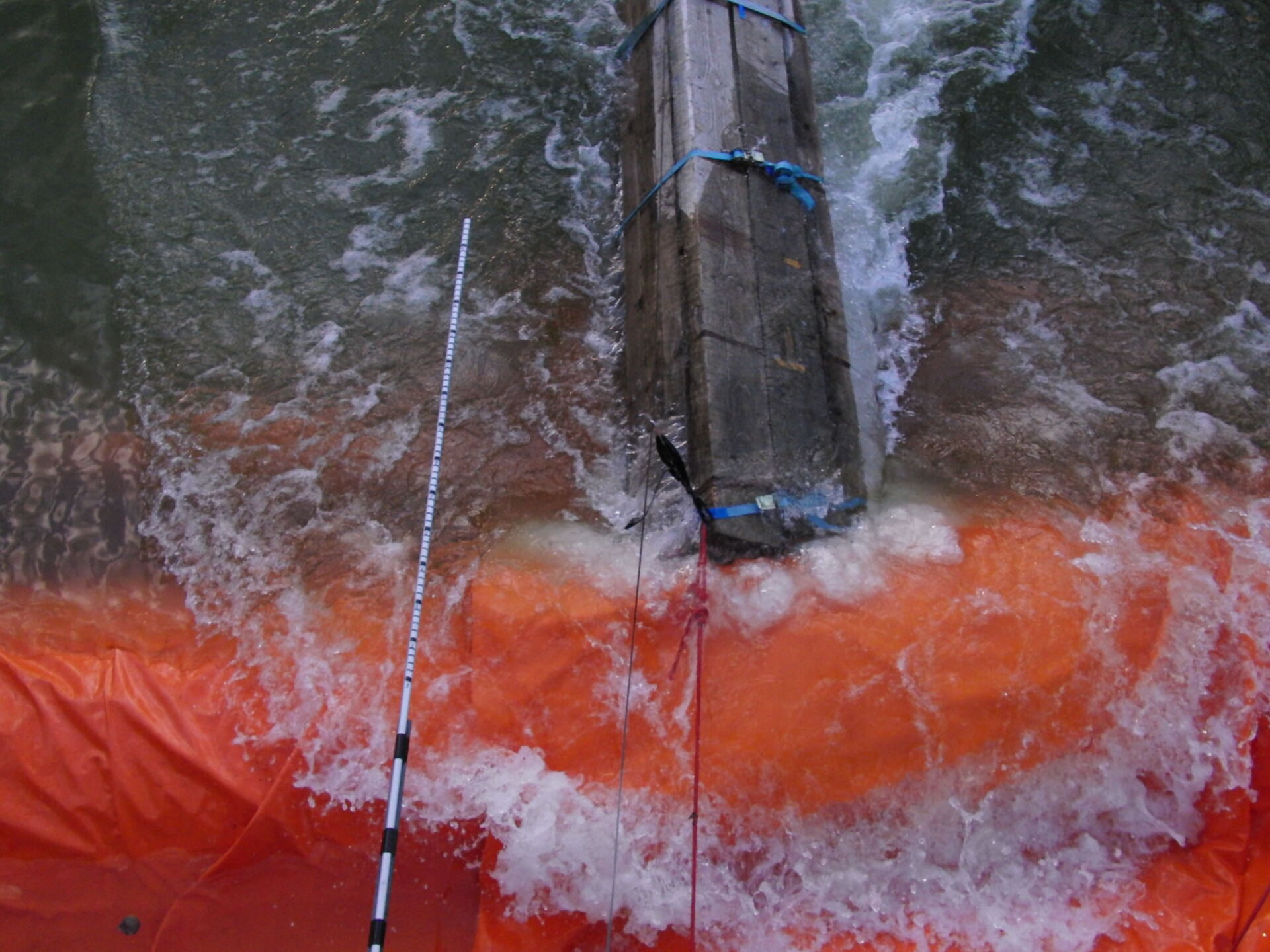 bei geringem Wasserstand durch den Wasserschwalll einer kräftigen Tauchpumpe