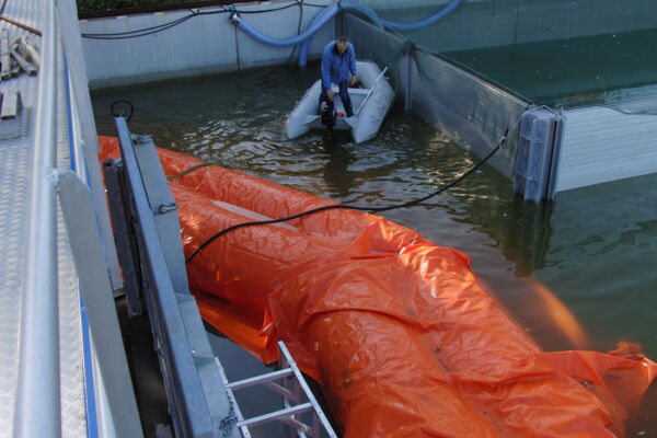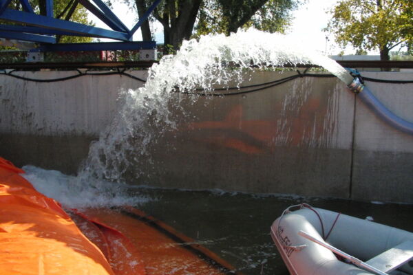2 kurze MOBILDEICH-Module wurden 100x gefüllt, 100x abgelassen, 100x zusammengerollt, 100x ausgerollt, 100x kurz über den Boden gezogen.