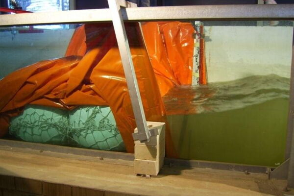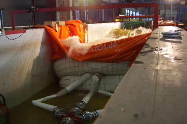 Die Standfestigkeit des MOBILDEICHs war auch nach vielen Wellen nicht gefährdet. Das Modul hat sich nach mehreren Testreihen nicht verschoben, obgleich bereits ein erheblicher Wellenüberlauf stattgefunden hat.